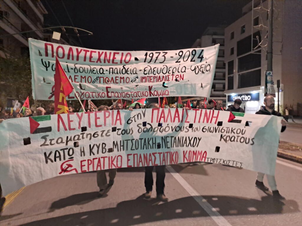 Στην πολύπαθη Ελλάδα, η ακροδεξιά κυβέρνηση του εγκλήματος των Τεμπών, της συγκάλυψης, της κρατικής τρομοκρατίας, της ακρίβειας, των σκανδάλων, η πιο αντιδραστική κυβέρνηση μετά την πτώση της Χούντας, γυαλίζει τη μαχαίρα της καταστολής, ποινικοποιώντας συνδικαλιστικές ελευθερίες, εκκενώνοντας κοινωνικούς χώρους, βγάζοντας τους Πραιτοριανούς της για να καταστείλει ταξικούς αγώνες και διαδηλώσεις. Παράλληλα, προσπαθεί να αφανίσει κάθε δημόσιο αγαθό, να μειώσει κάθε δημόσια δαπάνη για την υγεία και την παιδεία, ενώ ψηφίζει το νομοσχέδιο για την 13ωρη εργασία! Η Σούδα και άλλες νατοϊκές βάσεις στην Ελλάδα χρησιμοποιούνται για στρατιωτικές επεμβάσεις των Αμερικάνων και έπαιξαν άμεσο ρόλο στους βομβαρδισμούς ενάντια στη Γάζα και το Ιράν. Τα συνθήματα που γράφτηκαν με κόκκινο χρώμα έξω από τις πύλες του Πολυτεχνείου «Έξω οι ΗΠΑ – Έξω το ΝΑΤΟ» είναι πιο επίκαιρα από ποτέ.
