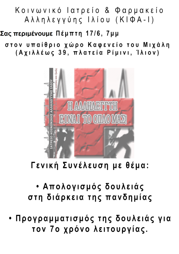 Την πρώτη μετά την πανδημία ανοικτή και με φυσική παρουσία Γενική Συνέλευση πραγματοποιεί το Κοινωνικό Ιατρείο Αλληλεγγύης Ιλίου που αισίως μπήκε στον 7ο χρόνο λειτουργίας του.