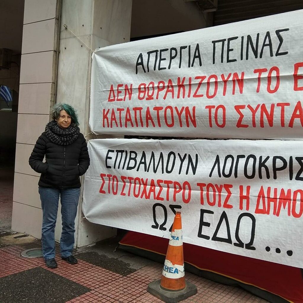 Η δημοσιογράφος Μαρίνα Βήχου σε απεργία πείνας έξω από την ΕΣΗΕΑ διαμαρτυρόμενη για την βίαιη κατάλυση της ελευθερίας της έκφρασης από την κυβέρνηση και το κράτος