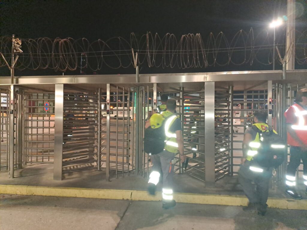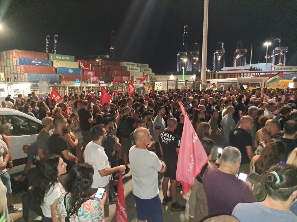 Το ραντεβού ήταν αργά, στις 10 το βράδυ. Από 9 -9:30 μ.μ. πλήθος κόσμου συνέρρεε. Σε ένα βιομηχανικό τοπίο, με φόντο τους τεράστιους γερανούς, με χιλιάδες κοντεινερ να σχηματίζουν αδιαπέραστα τείχη, με ψηλές τσιμεντένιες περιφράξεις και σγκαθωτα σύρματα, συγκεντρώθηκαν εργάτες και αλληλέγγυοι για να φωνάξουν όχι στη μεταφορά στρατιωτικού υλικού στο κράτος – δολοφόνο.