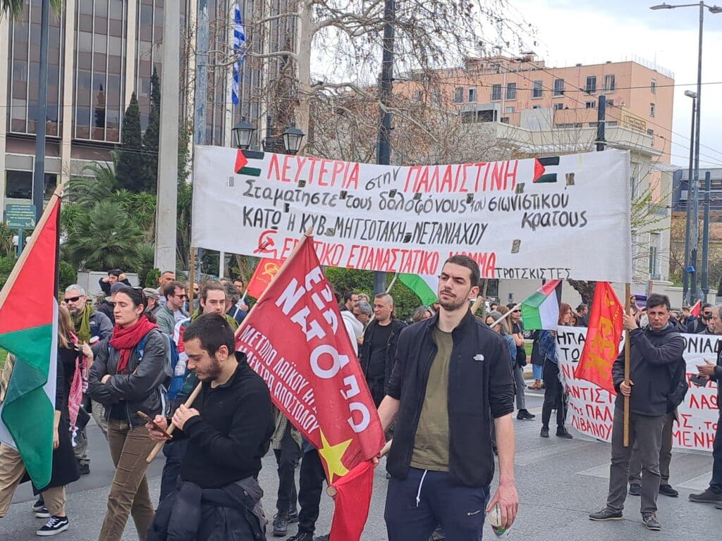 Διαδήλωση με συμμετοχή πολλών εκατοντάδων πραγματοποιήθηκε την Κυριακή 23 Μαρτίου στην Αθήνα. Μετά από μια αυθόρμητη διαδήλωση της Τετάρτης 19/3 για την οποία γράψαμε στη νπ και μια διαδήλωση του ΚΚΕ την Παρασκευή, αυτή ήταν η τρίτη διαδήλωση υπέρ της Παλαιστίνης στην Αθήνα.