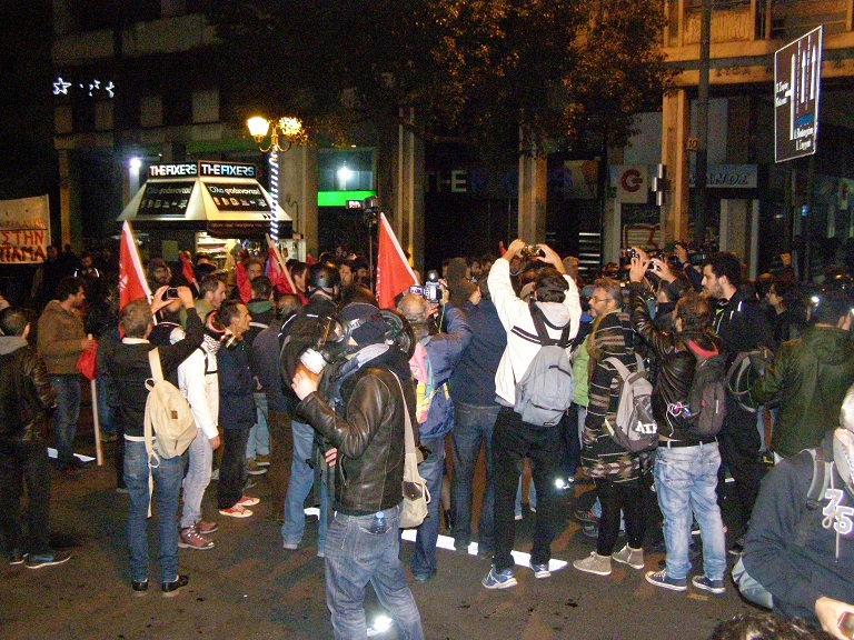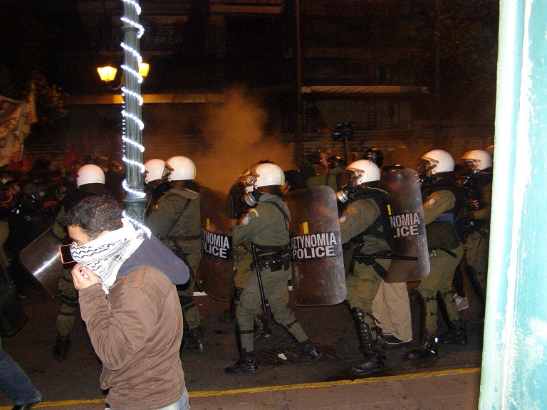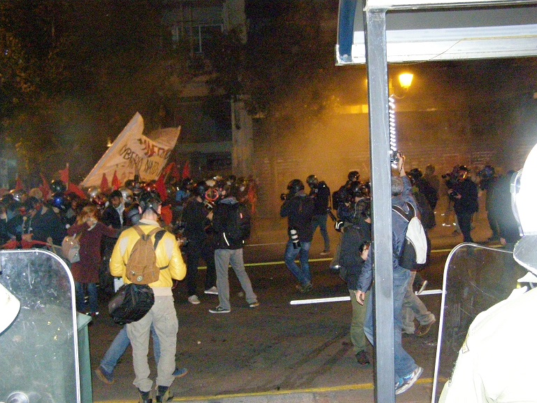 Τα υπόλοιπα μπλοκ (φοιτητικοί σύλλογοι, σωματεία και πρωτοβουλίες για το προσφυγικό, ΑΝΤΑΡΣΥΑ-ΝΑΡ, ΕΕΚ), χιλιάδες διαδηλωτές συνολικά, στάθηκαν για αρκετή ώρα μπροστά στις παρατεταγμένες δυνάμεις της αστυνομίας. Κάποια στιγμή οι διαδηλωτές ήλθαν σε σύγκρουση με την αστυνομία. Με χειροβομβίδες κρότου-λάμψης, ρίψεις χημικών και χρήση ροπάλων η αστυνομία απώθησε τα πρώτα μπλοκ διαδηλωτών. Και κατά την οπισθοχώρηση, τα ΜΑΤ που είχαν παραταχθεί κατά μήκος της Σταδίου έρριχναν χημικά και χειροβομβίδες κρότου-λάμψης. “Κόλαση” δημιουργήθηκε όταν δυνάμεις της αστυνομίας κινήθηκαν από πίσω, και μη αφήνοντας οδό διαφυγής έπνιξαν τα μπλοκ των διαδηλωτών στα χημικά και με τις κρότου-λάμψης δημιούργησαν μια φρικτή κατάσταση. Διαδηλωτές έπεφταν κάτω, άλλοι συμπιέζονταν στα κάγκελα και ζωές κινδύνεψαν από την αχαλίνωτη αστυνομική βία. Οι επικεφαλής των αστυνομικών δυνάμεων -και οι πολιτικοί τους προϊστάμενοι- προφανώς για να δείξουν στις ΗΠΑ την “αποφασιστικότητά” τους -και την υποταγή τους- έθεσαν σε κίνδυνο ανθρώπινες ζωές από τη στιγμή που δεν άφηναν οδό διαφυγής στους πνιγμένους από τοξικά δακρυγόνα διαδηλωτές.