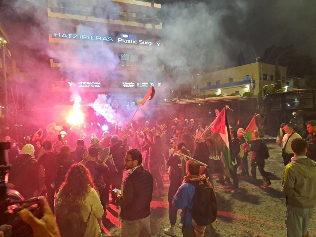 Με τη βία των ΜΑΤ, δημιουργώντας “ατμόσφαιρα” Γάζας με βόμβες κροτου- λάμψης, δακρυγόνα και γκλοπς, επιτέθηκαν στους διαδηλωτές την ώρα που αποχωρούσαν από την σιωνιστική πρεσβεία.