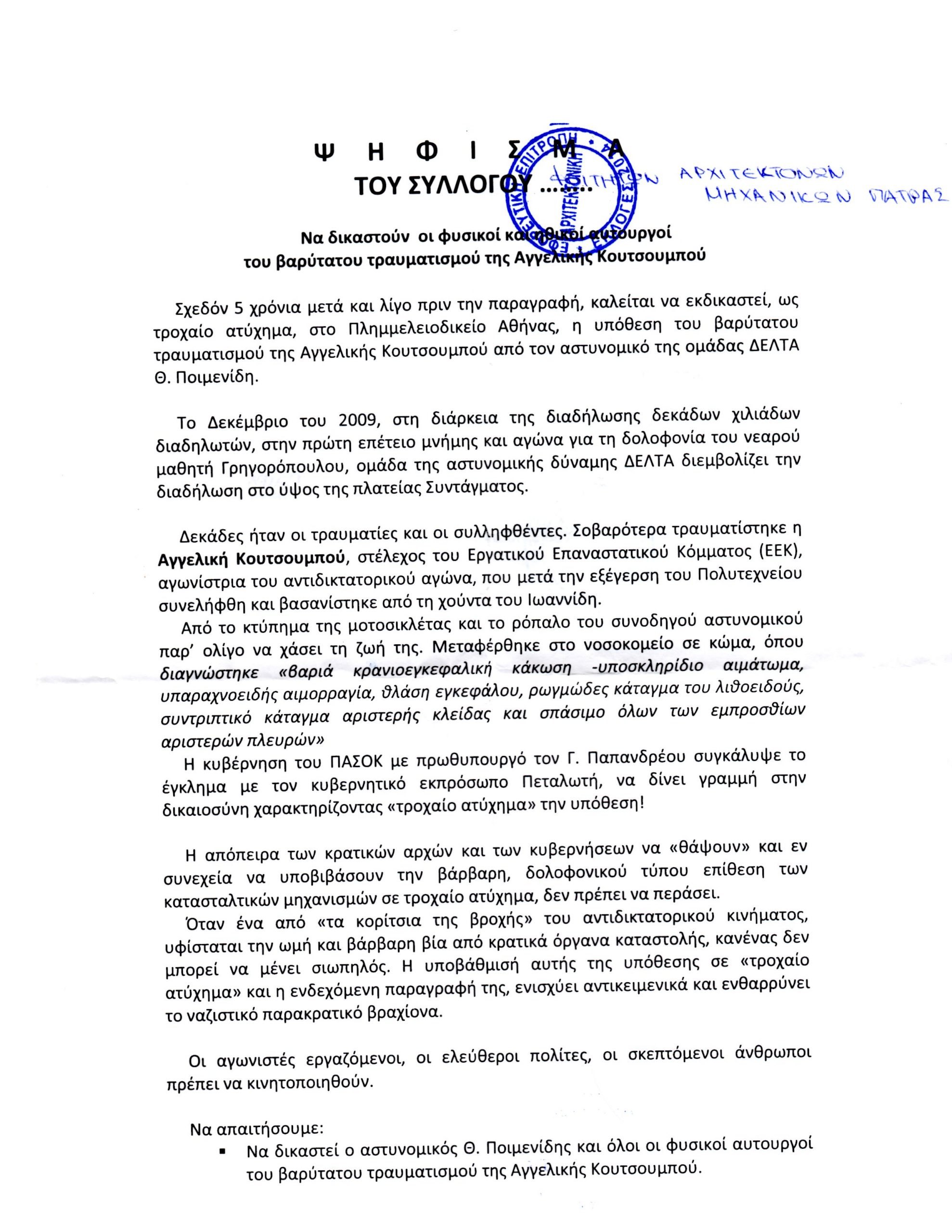 ΨΗΦΙΣΜΑ ΑΛΛΗΛΕΓΓΥΗΣ ΣΤΗ ΑΓΓΕΛΙΚΗ ΚΟΥΤΣΟΥΜΠΟΥ ΤΟΥ ΦΟΙΤΗΤΙΚΟΥ ΣΥΛΛΟΓΟΥ ΑΡΧΙΤΕΚΤΟΝΙΚΗΣ ΠΑΤΡΑΣ