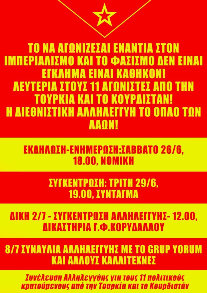 Με κεντρικό σύνθημα “Το να αγωνίζεσαι ενάντια στον ιμπεριαλισμό και το φασισμό δεν είναι έγκλημα! Είναι καθήκον!”, η Επιτροπή Αλληλεγγύης στους Πολιτικούς Κρατούμενους στην Τουρκία και το Κουρδιστάν καλεί τον ελληνικό λαό και τις μαχόμενες συλλογικότητες σε αλληλεγγύη στους 11 δικαζόμενους αγωνιστές – μέλη της Επιτροπής Αλληλεγγύης.