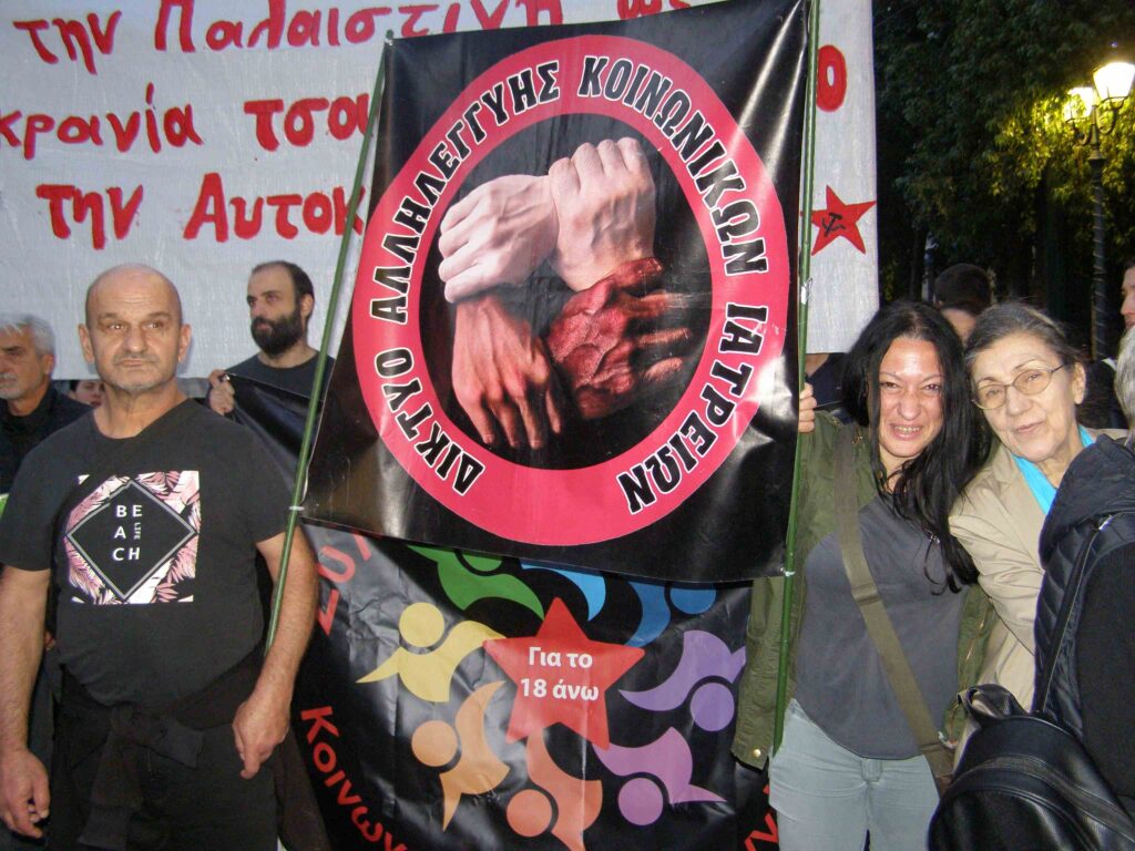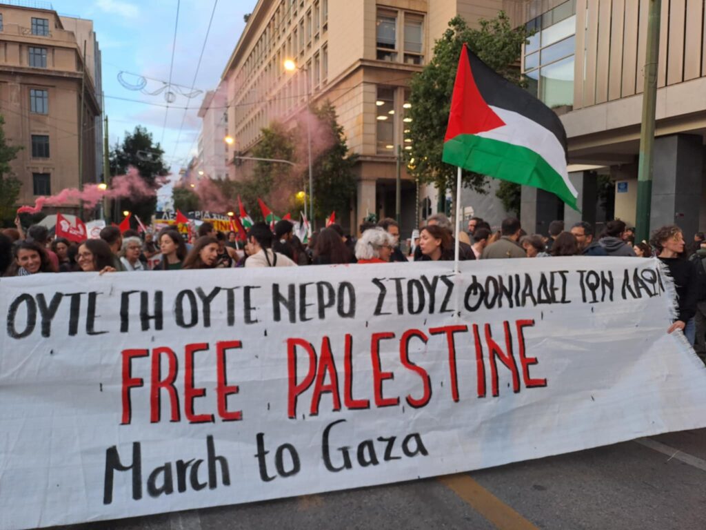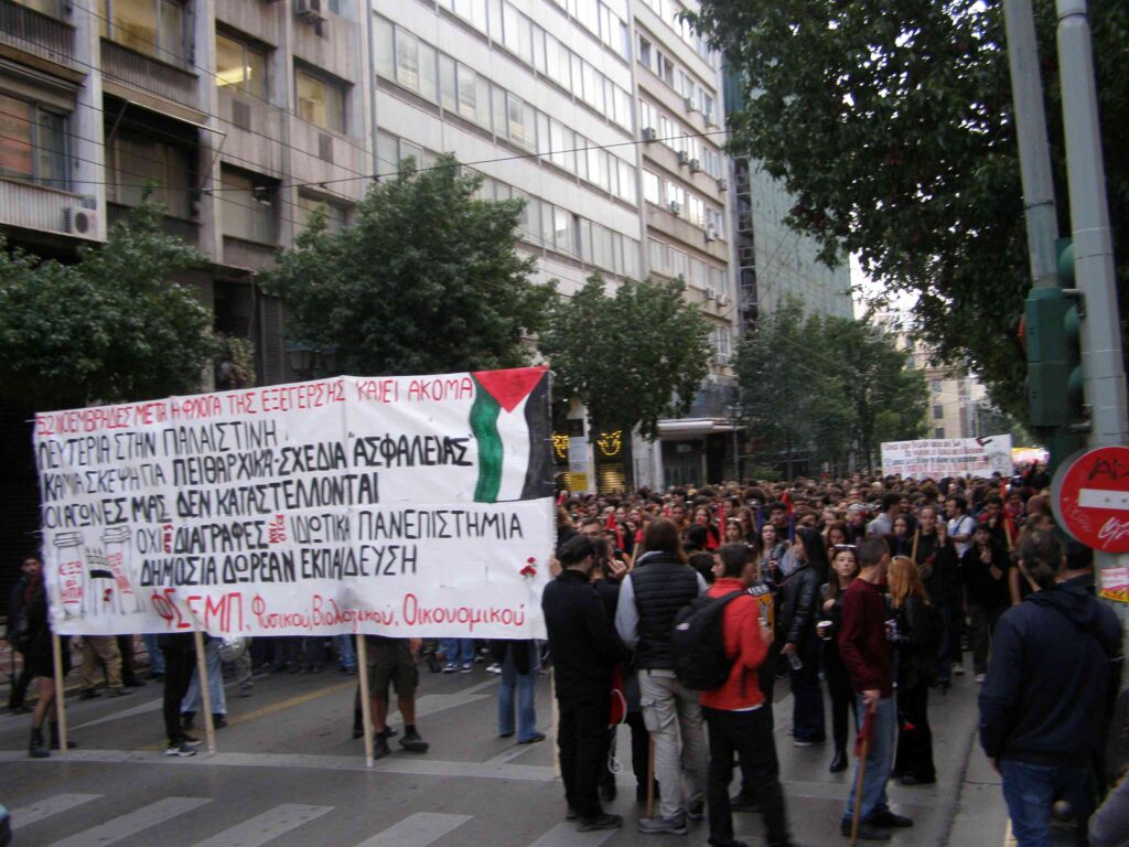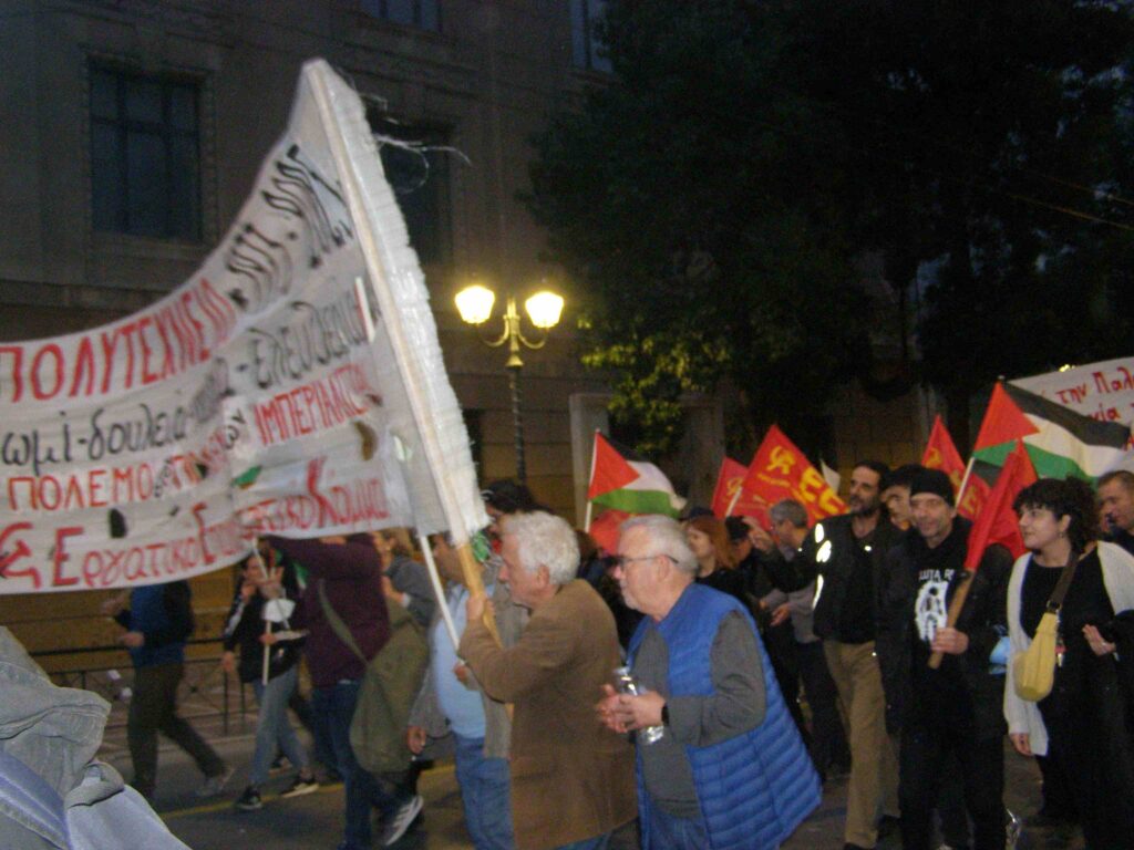 Ένα άλλο σύνθημα που κυριαρχούσε ήταν το “Λευτεριά στην Παλαιστίνη” – υποστήριξη στον μαχόμενο παλαιστινιακό λαό που υφίσταται τη γενοκτονική επίθεση του σιωνιστικού αποικιοκρατικού κράτους του Ισραήλ– που στηρίζεται, χρηματοδοτείται, εξοπλίζεται από τον ιμπεριαλισμό των ΗΠΑ, της ΕΕ και του υποτακτικού τους, “κούλη” της Δεξιάς, Κυρ. Μητσοτάκη.