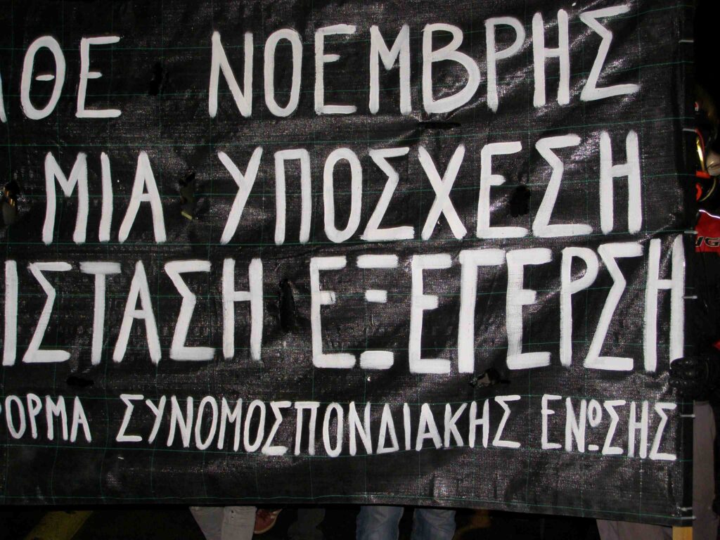 Το Πολυτεχνείο για περισσότερο από μισό αιώνα παραμένει βαθιά χαραγμένο στην ιστορική συνείδηση και μνήμη του λαού. Είναι όχι απλά ένα κορυφαίο γεγονός δίπλα σε άλλα, είναι ένα συμβάν της νεότερης ελληνικής ιστορίας που φωτίζει ως αστερισμός τους ταξικούς κοινωνικούς αγώνες. Η εθνικο απελευθερωτική επανάσταση του 1821, μαζί με την αντιφασιστική εργατο-αγροτική επανάσταση του 1941 – 49, και την εξέγερση του Πολυτεχνείου αποτελούν τη συναστρία των επαναστατικών φωτεινών σημείων για την απελευθέρωση από κάθε είδους σκλαβιά. Θα μπορούσαμε ίσως να προσθέσουμε εδώ και την εξέγερση του Δεκέμβρη του 2008. Σε κάθε περίπτωση το Πολυτεχνείο φωτίζει τις αντιστάσεις του παρόντος και τις εξεγέρσεις του μέλλοντος λειτουργώντας ως εφαλτήριο και πηγή έμπνευσης για τους νέους αγώνες – για να δικαιωθεί το αίμα το αδικαίωτο των νεκρών και των τραυματιών του Νοέμβρη του 1973, κι όλων των θυμάτων της χούντας και της κρατικής και ταξικής βίας, για να ολοκληρώσουμε ό,τι αφήσαμε ημιτελές!