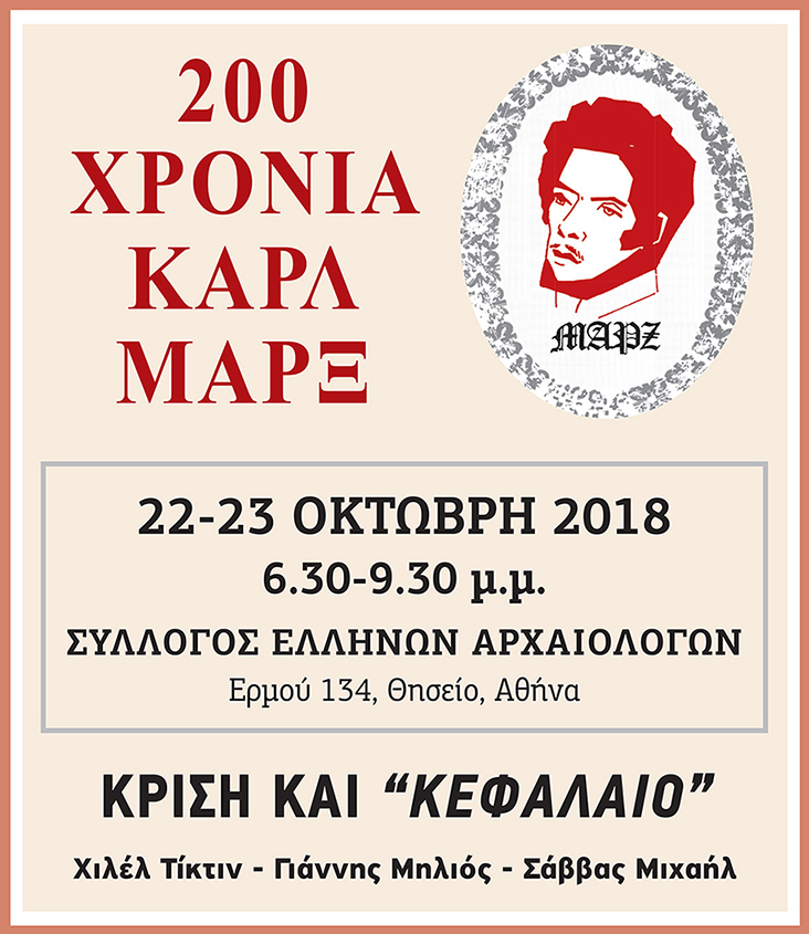 Tην Δευτέρα 22 και Tρίτη 23 Οκτωβρίου, στις 18:30 μ.μ. – 21:30 μ.μ., στον Σύλλογο Ελλήνων Αρχαιολόγων (ΣΕΑ – Eρμού 134, Θησείο), το περιοδικό του ΕΕΚ Επαναστατική Μαρξιστική Επιθεώρηση και το διεθνές θεωρητικό περιoδικό Critique συνδιοργανώνουν Διημερίδα προς τιμή των 200 χρόνων από την γέννηση του Καρλ Μαρξ με γενικό θέμα Κρίση και “Κεφάλαιο”. Μεταξύ των ομιλητών θα είναι οι: • Χιλέλ Τίκτιν (ομότιμος καθηγητής του Πανεπιστημίου της Γλασκώβης ιδρυτής και εκδότης της Critique) που θα μιλήσει με θέμα “Μια Διαρκής Κρίση;” • Λατίφ Πάρκερ (Κέιπ Τάουν, Νότια Αφρική) με θέμα “Ο αντίκτυπος της παγκόσμιας καπιταλιστικής κρίσης στην Αφρική” • Annamaria Artner (Ινστιτούτο Παγκόσμιας Οικονομίας, Βουδαπέστη) με θέμα “Παγκόσμιοι κύκλοι και κρίσεις – μια μαρξιστική ανάλυση” • Γιάννης Μηλιός (καθηγητής ΕΜΠ, περιοδικό Θέσεις) με θέμα “Περισσότερη πειθαρχία για περισσότερη αστάθεια: το χρηματοοικονομικό κεφάλαιο ως τεχνολογία της εξουσίας” • Σάββας Μιχαήλ (ΕΕΚ) με θέμα: “Πού πάει η Ευρώπη; Κρίση, ταξική Πάλη και άνοδος της άκρας Δεξιάς”.