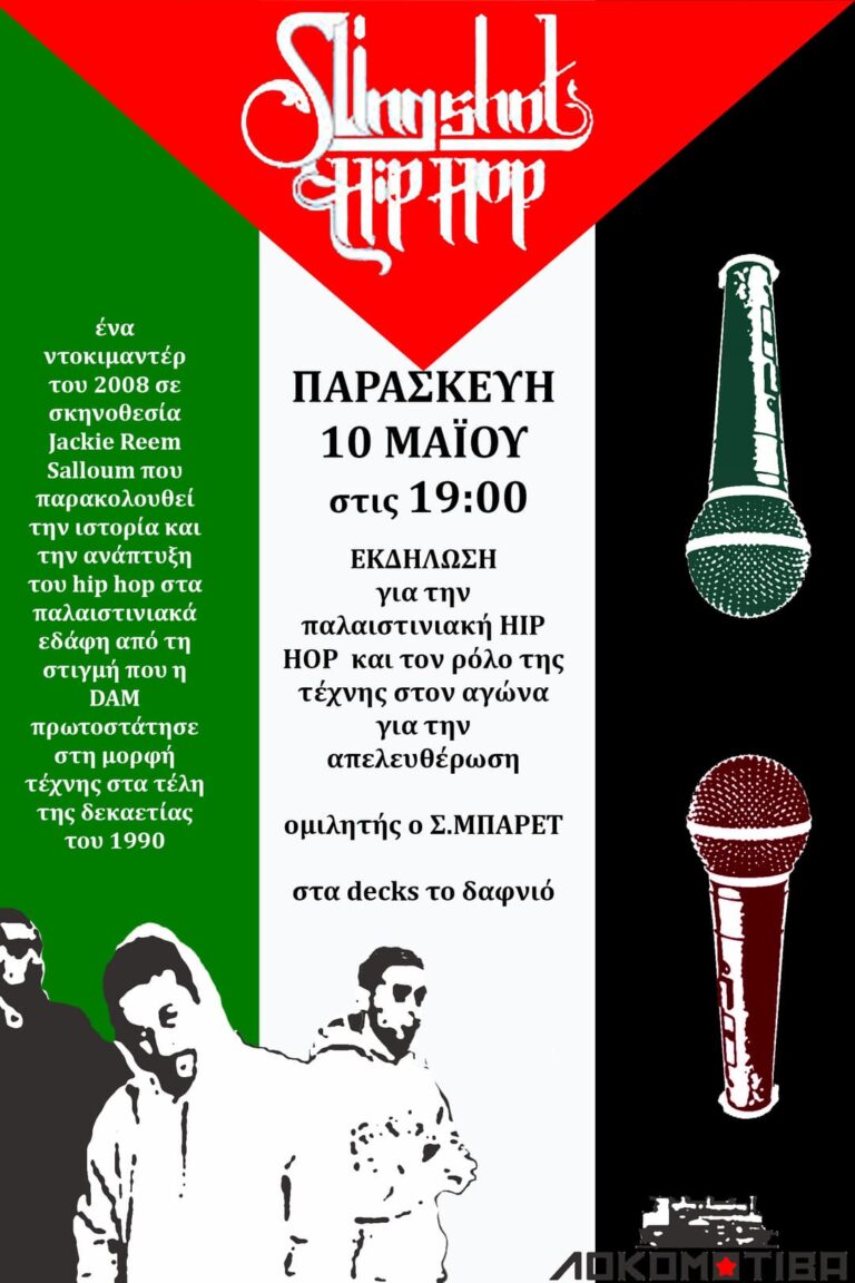 Εκδήλωση για το Παλαιστινιακό hip hop και το ρόλο της τέχνης στον αγώνα για την απελευθέρωση πραγματοποιείται την Παρασκευή 10 Μαΐου στη Λοκομοτίβα, στα Εξάρχεια (Mπόταση και Σολωμού). Θα προβληθεί…