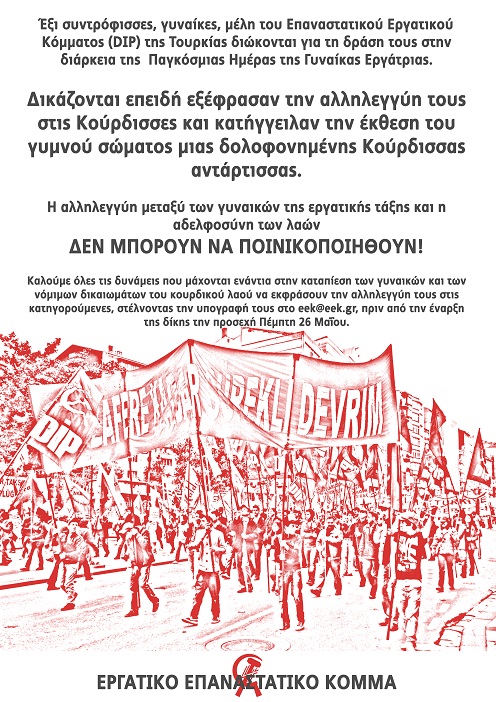 Έξι γυναίκες μέλη του Επαναστατικού Εργατικού Κόμματος (DIP) της Τουρκίας διώκονται για τη δράση για την Παγκόσμια Ημέρα των Εργαζόμενων Γυναικών. Δικάζονται τώρα για υποστήριξη και προπαγάνδα τρομοκρατίας απλά επειδή εξέφρασαν αλληλεγγύη στις Κούρδισσες γυναίκες οι οποίες έπεσαν θύματα ανηλεούς καταστολής και εξευτελισμού από τις δυνάμεις ασφαλείας.