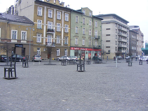 Λίγο πιο κάτω, περνάμε τη γέφυρα του Βιστούλα και μπαίνουμε στην περιοχή που οι Γερμανοί έφτιαξαν το μεγάλο γκέτο της Κρακοβίας. Εκκενώνοντας το Kazimierz και συγκεντρώνοντας όλο τον εβραϊκό πληθυσμό που είχε απομείνει στην πόλη, συνολικά 16 χιλιάδες που είχαν επιβιώσει της πρώτης εκκαθάρισης του 1940, προς την συνοικία της περιοχής του Krakus Mound. Εκεί ζούσαν μέχρι τότε όχι πάνω από χίλιοι Πολωνοί, που εκτοπίστηκαν για να πάρουν την θέση τους στριμωγμένοι υπερ-πολλαπλάσιοι, που θα κρατούνταν υπό περιορισμό στην περιοχή του γκέτο για να εργαστούν στην βιομηχανία που πλέον εξυπηρετούσε τους πολεμικούς σκοπούς της ναζιστικής Γερμανίας. Και αυτοί ήταν οι πιο τυχεροί, καθώς οι υπόλοιποι από τους συνολικά 70 χιλιάδες εβραίους της προπολεμικής Κρακοβίας, είχαν ήδη σταλεί σε στρατόπεδα συγκέντρωσης Οι Eβραίοι του Kazimierz διατάχτηκαν να φύγουν από τα σπίτια τους και να πάρουν μόνο τα απολύτως αναγκαία για να πάνε στην άλλη μεριά του ποταμού. Εκεί, πριν μπούνε στην περιοχή του Γκέτο, τους σταμάτησαν οι Γερμανοί ναζί στην πλατεία Bohaterow και τους υποχρέωσαν να αφήσουν το μεγαλύτερο μέρος από τις βαριές οικοσκευές που μερικοί είχαν πάρει μαζί τους και να μπουν στριμωγμένοι στα νέα τους σπίτια. Όταν τον Μάρτη του 1943 οι Eβραίοι εκτοπίστηκαν εκ νέου για να πάρουν τον δρόμο του θανάτου προς τα στρατόπεδα συγκέντρωσης και το γκέτο εκκενώθηκε, υποχρεώθηκαν ξανά να αφήσουν φεύγοντας από αυτό στην ίδια πλατεία ό,τι μικρο-έπιπλο είχε ξεφύγει και να κρατήσουν μόνο μια βαλίτσα και τα τιμαλφή τους. Στην πλατεία αυτή μεταπολεμικά, εις μνήμη του πλιάτσικου στο οποίο επιδόθηκαν οι ναζί και οι ντόπιοι συνεργάτες τους, πάνω στις οικοσκευές των εβραίων, ένα συμβολικό μνημείο έχει φτιαχτεί με μεγάλες ξύλινες καρέκλες καρφωμένες πάνω από τα φώτα της πλατείας για να θυμίζουν και να συμβολίζουν την αρπαγή αυτή. Στην άκρη της ίδιας πλατείας, βρίσκεται το μνημείο της αλληλεγγύης στον χώρο του φαρμακείου του Tadeusz Pankiewicz, του θαρραλέου πολωνού φαρμακοποιού που μαζί με τις τρεις ακούραστες υπαλλήλους του, πήρε ειδική άδεια να παραμείνει στην περιοχή του εβραϊκού γκέτο και να συνεχίσει να βοηθά το νέο πληθυσμό της, ρισκάροντας την ζωή του όταν φυγάδευε από εκεί μερικούς Eβραίους. Κατά τη διάρκεια της κατοχής αλλά και μετά τον πόλεμο το μεγαλύτερο μέρος του τείχους του γκέτο γκρεμίστηκε. Ένα από τα λίγα σημεία του που παραμένει στη θέση του και μας δίνει μια εικόνα του πώς έδειχνε, βρίσκεται στην Lwoska street. Εκεί βλέπουμε την τοπική εγκληματική διαστροφή των τοπικών ναζί. Ο τοίχος του γκέτο σε αντίθεση με άλλους σε άλλα ανάλογα γκέτο σε άλλες κατεχόμενες πόλεις, έχει το σχήμα των εβραϊκών ταφοπλακών, θέλοντας προφανώς να συμβολίσει ότι το γκέτο στην πραγματικότητα ήταν ο τάφος τους.