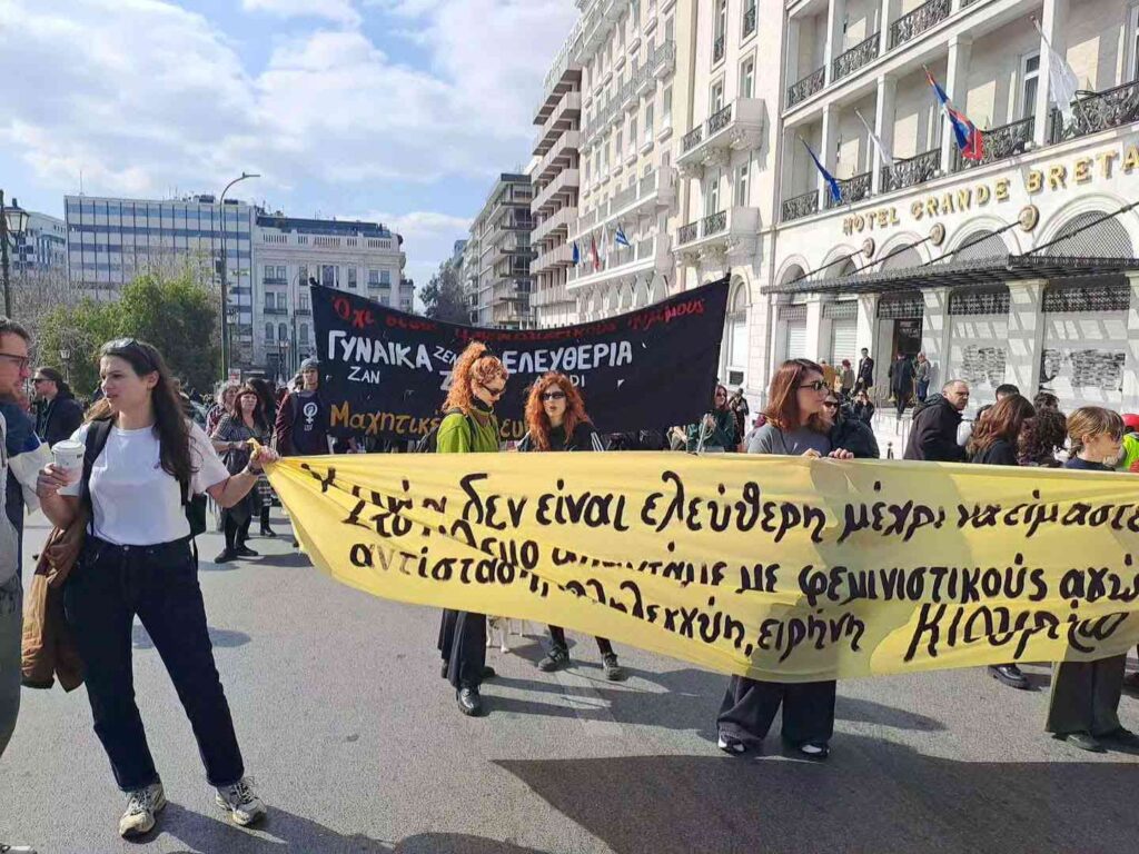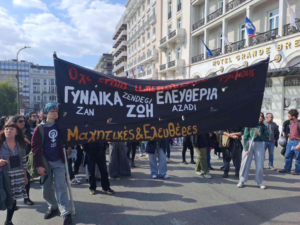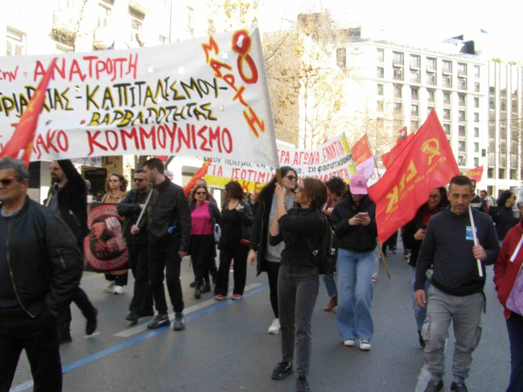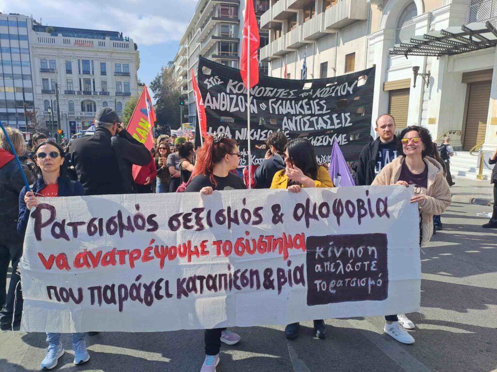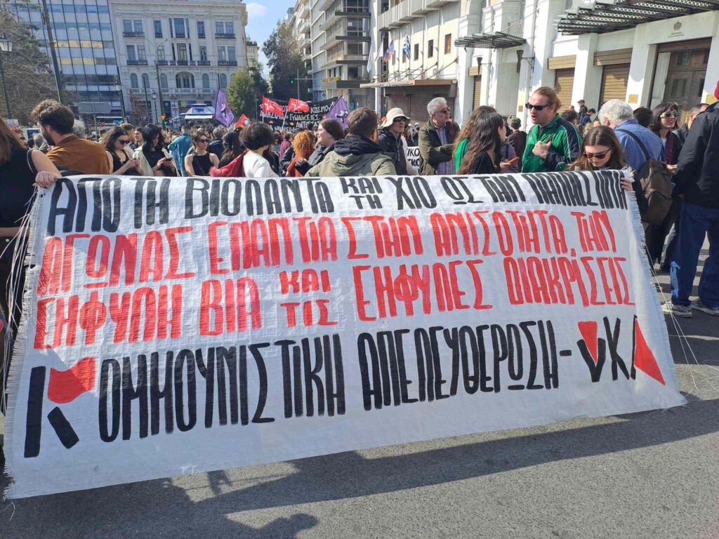 Πλήθος συλλογικοτήτων, φεμινιστικές οργανώσεις, συνδικάτα εκπαιδευτικών και άλλα, πολιτικές οργανώσεις της αριστεράς (ανάμεσά του το ΕΕΚ) και του αναρχοκομμουνισμού έλαβαν μέρος. Πολυπληθές, με πολλές εκατοντάδες άτομα ήταν το μπλοκ των κατειλημμένων Προσφυγικών της Αλεξάνδρας που απειλούνται με έξωση από τα αδηφάγα σχέδια των κερδοσκόπων και την αστυνομία. Η πορεία, με σημαντική καθυστέρηση λόγω του διεξαγόμενου ημιμαραθώνιου έφθασε στην πλατεία Συντάγματος και κατηφόρισε την Πανεπιστημίου και σημαντικό μέρος της έφθασε μπροστά στο υπουργείο Απασχόλησης στην Σταδίου – το υπεύθυνο υπουργείο για την καταστροφή των εργασιακών σχέσεων και την ασυδοσία των αφεντικών που οδήγησε στον φρικτό θάνατο 5 εργατριών σε νυκτερινή βάρδια…
