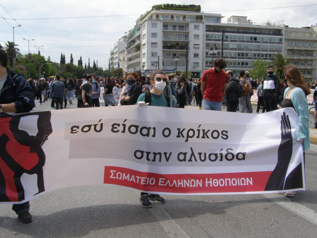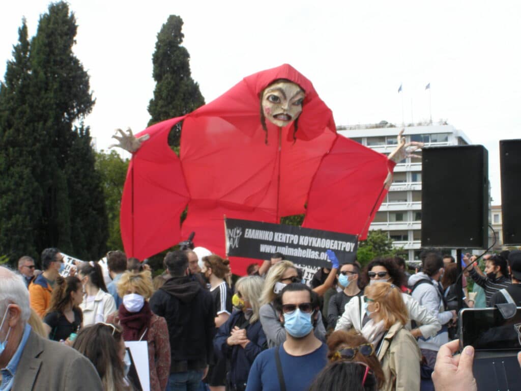 Χιλιάδες κόσμος της τέχνης και του πολιτισμού (του θεάτρου, του κινηματογράφου, του χορού, της μουσικής και του τραγουδιού, των εικαστικών τεχνών, του κουκλοθέατρου κ.λπ.) κατέκλυσαν το Σύνταγμα το μεσημέρι της Πέμπτης 7 Μαΐου.