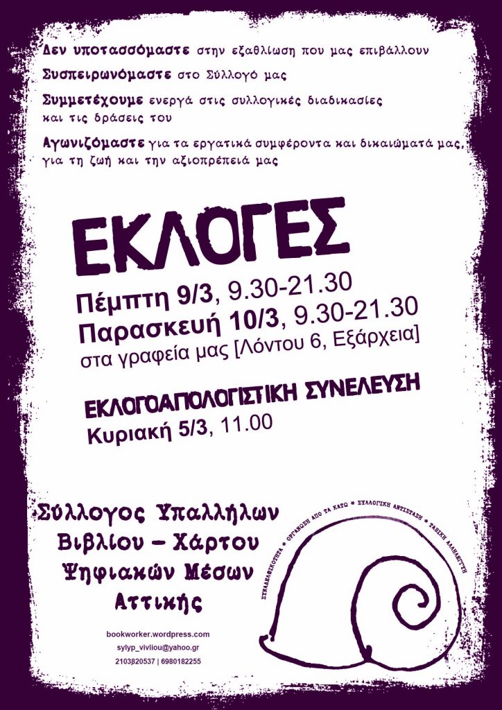 Να συμμετέχουμε όλοι και όλες στην προσεχή εκλογοαπολογιστική συνέλευση την Κυριακή 5 Μάρτη στις 11πμ και στις εκλογές στις 9 & 10 Μάρτη (9.30πμ-9.30μμ). Όχι για να αναθέσουμε τα καθήκοντά μας σε κάποιο Δ.Σ., αλλά για να δείξουμε και με αυτόν τον τρόπο τη συλλογική μας δύναμη. Η μαζική συμμετοχή μας στις εκλογές θα αποτελέσει ένα βασικό διαπραγματευτικό χαρτί στους εργατικούς αγώνες που έχουμε μπροστά μας.