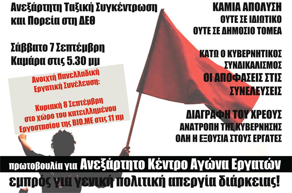 Θα ήταν όμως τραγικό λάθος να αφεθεί μια τόσο σοβαρή υπόθεση που απαιτεί θυσίες, να οργανωθεί και να διεξαχθεί από όσους μας έχουν προδώσει τρία χρόνια τώρα, όσους αναρωτιούνται αν υπάρχουν απεργιακές προϋποθέσεις, όσους ταλαντεύονται ή όσους δεν έχουν εμπιστοσύνη στους εργαζόμενους και το 1,5 εκατομμύριο ανέργους στους οποίους πρέπει να γίνει προσκλητήριο αγώνα. Η Πρωτοβουλία για Ανεξάρτητο Κέντρο Αγώνα Εργατών και από την ΔΕΘ δίνει το μήνυμα της πάλης για την πολιτική και ιδεολογική ανεξαρτησία της εργατικής τάξης από την κυβέρνηση, τα αφεντικά, το κράτος. Παλεύει για την ανεξάρτητη πάλη της τάξης μας από τους προδότες της ΓΣΕΕ και ΑΔΕΔΥ και από κάθε γραφειοκρατικό μόρφωμα στα συνδικάτα και τις οργανώσεις μας. Παλεύουμε για την οργάνωση γενικής πολιτικής απεργίας διαρκείας από τα κάτω, μέσα από γενικές συνελεύσεις εργατών, απεργιακές επιτροπές εγχειρήματα αυτοοργάνωσης και λαϊκές συνελεύσεις. Παλεύουμε για το χτίσιμο της επαναστατικής ηγεσίας για την ανατροπή του καπιταλισμού. Καμιά επιστροφή στο παρελθόν ούτε στα χρόνια της πλαστής ευημερίας του 2009 είναι δυνατή. Το χτίσιμο μιας νέας σοσιαλιστικής κοινωνίας είναι η μόνη διέξοδος για να ξανανοίξουν τα εργοστάσια, να υπάρξει δουλειά για όλους, κοινωνική δικαιοσύνη και ισότητα.