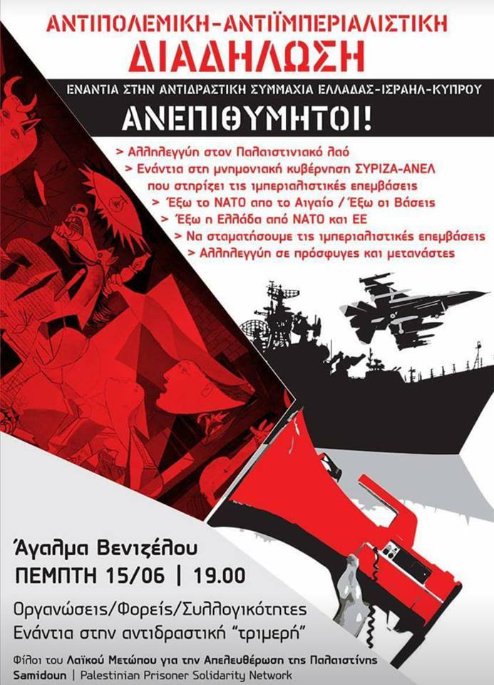 H συνάντηση της «τριπλής συμμαχίας» στη Θεσσαλονίκη έρχεται λίγες μόνο μέρες μετά την ηρωική απεργία πείνας για την Eλευθερία και την Aξιοπρέπεια 1600 παλαιστινίων πολιτικών κρατουμένων στις φυλακές του Iσραήλ. Kαι έρχεται στην 50ή επέτειο από τον πόλεμο των Έξι Hμερών και την κατάληψη όλων των εδαφών της Παλαιστίνης. Όχι στη νομιμοποίηση και τον εξωραϊσμό του ακροδεξιού σιωνισμού, της κατοχής της Παλαιστίνης και καταπίεσης του παλαιστινιακού λαού! Kανείς λαός δεν μπορεί να είναι ελεύθερος όσο δίπλα του υπάρχουν λαοί υποδουλωμένοι και καταπιεσμένοι.