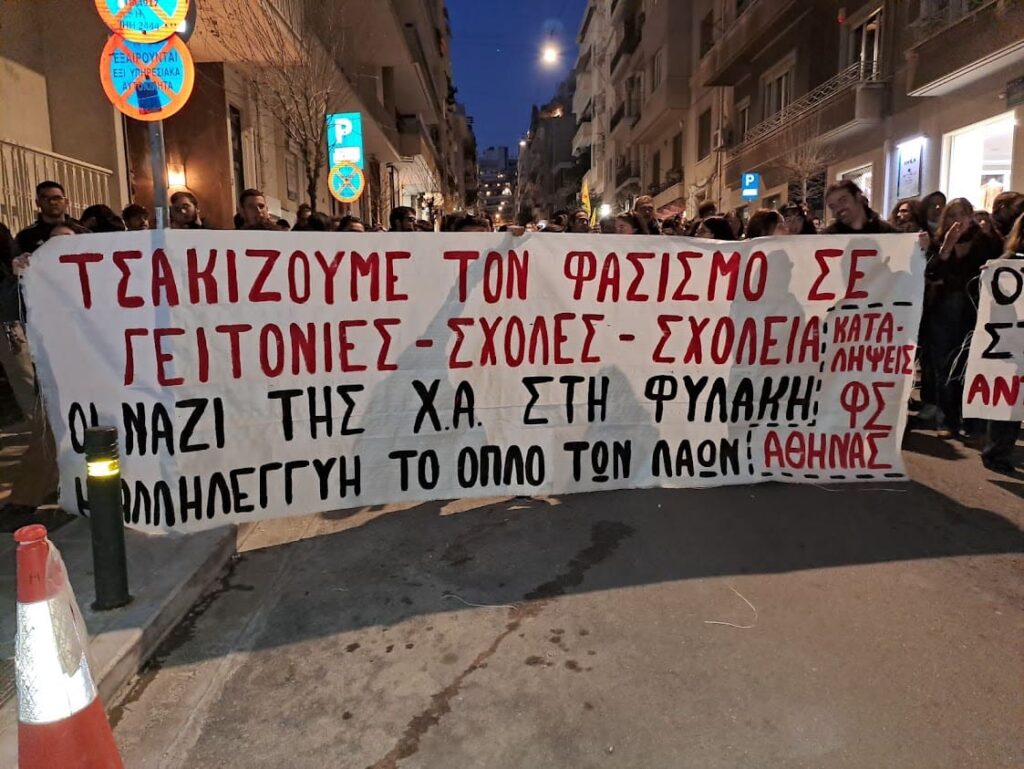 Δεκάδες αντιφασίστες, συντρόφισσες και σύντροφοι, το απόγευμα του Σαββάτου 3/2, οργάνωσαν αντιφασιστική πορεία από την πλατεία Κολωνακίου προς την πλατεία Ρηγίλλης. Οι διαδηλωτές πήγαν στο Κολωνάκι ύστερα από την απαγόρευση από την αστυνομία όλων των διαδηλώσεων σε μια μεγάλη περιοχή του κέντρου της Αθήνας (από τις 6 π.μ. του Σαββάτου 3/2 έως τις 6 π.μ. της Κυριακής 4/2).