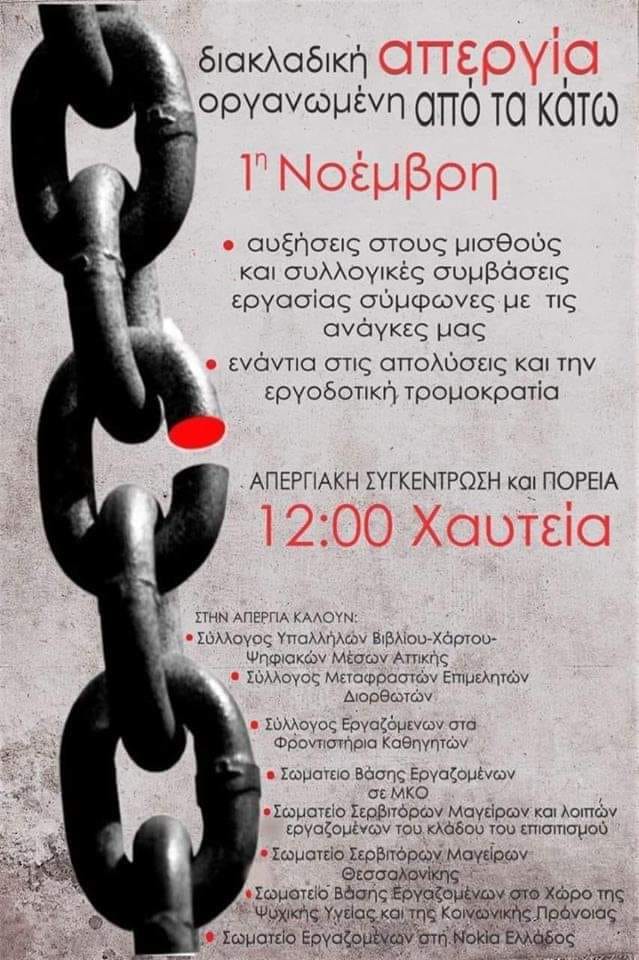 Eπτά σωματεία βάσης, ο Σύλλογος Υπαλλήλων Βιβλίου – Χάρτου – Ψηφιακών Μέσων Αττικής, ο Σύλλογος Μεταφραστών Επιμελητών Διορθωτών, ο Σύλλογος Εργαζομένων στα Φροντιστήρια Καθηγητών, το Σωματείο Bάσης Eργαζομένων σε MKO, το Σωματείο Σερβιτόρων Μαγείρων και Λοιπών Εργαζομένων του κλάδου του Επισιτισμού, το Σωματείο Σερβιτόρων Mαγείρων Θεσσαλονίκης και το Σωματείο Βάσης Εργαζομένων στο Χώρο της Ψυχικής Υγείας και της Κοινωνικής Πρόνοιας, απεργούν την Πέμπτη 1η Nοεμβρίου.