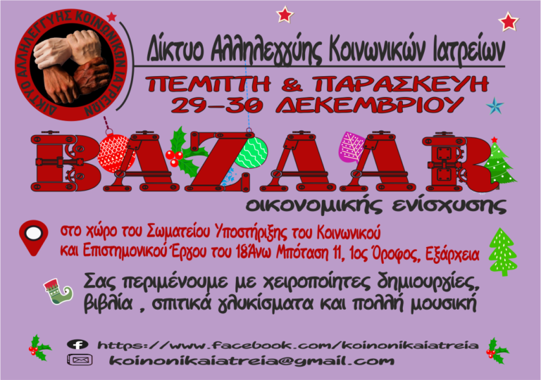 Το Σωματείο Υποστήριξης του επιστημονικού και κοινωνικού έργου του 18Ανω, μαζί με το Δίκτυο Αλληλεγγύης Κοινωνικών Ιατρείων, οργανώνει Χριστουγεννιάτικο Bazaar το διήμερο Πέμπτης – Παρασκευής 29 – 30 Δεκέμβρη 2022…