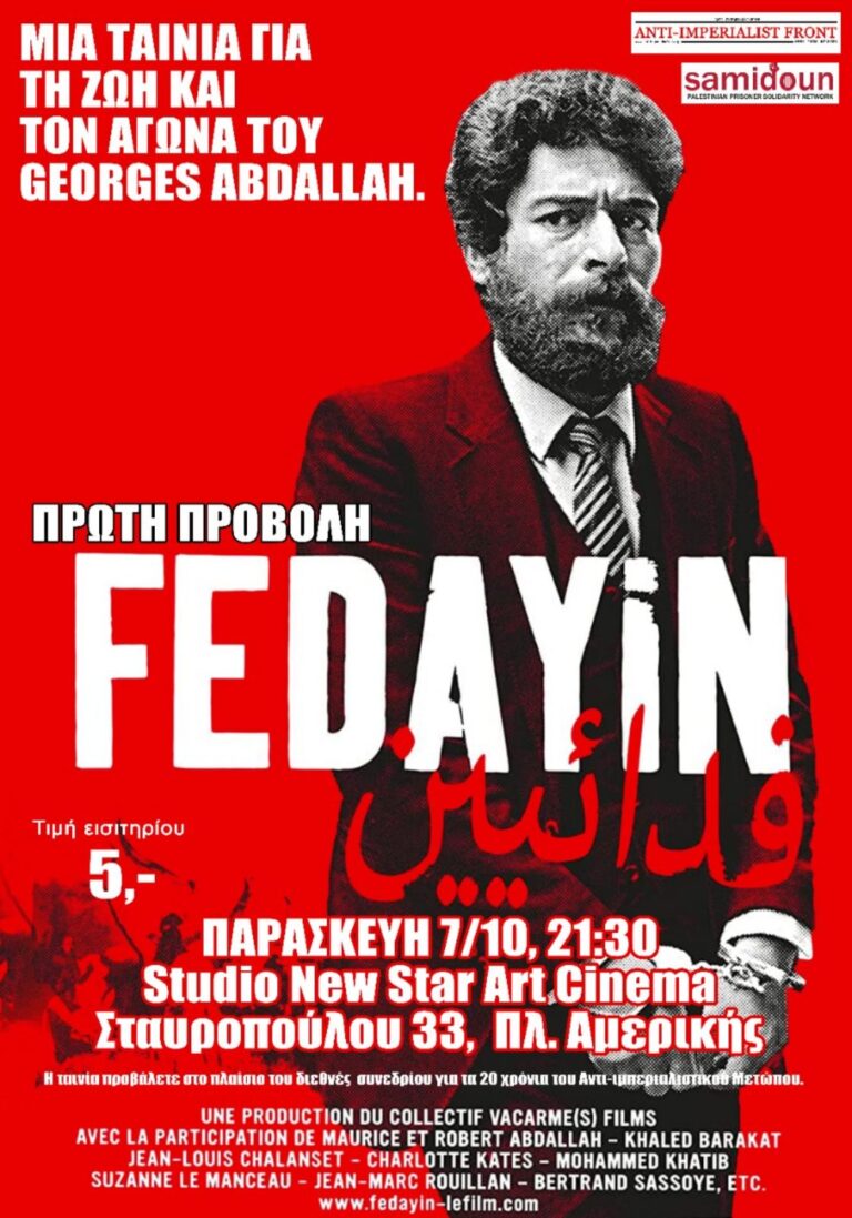 Πρώτη προβολή στο STUDIO NEW STAR ART CINEMA, Παρασκευή 7/10, 21:00 (Σταυροπούλου 33, Πλ. Αμερικής) Το Aντιιμπεριαλιστικό Μέτωπο και το Δίκτυο για τους Παλαιστίνιους Κρατούμενους Samidoun παρουσιάζουν σε πρώτη προβολή,στον…