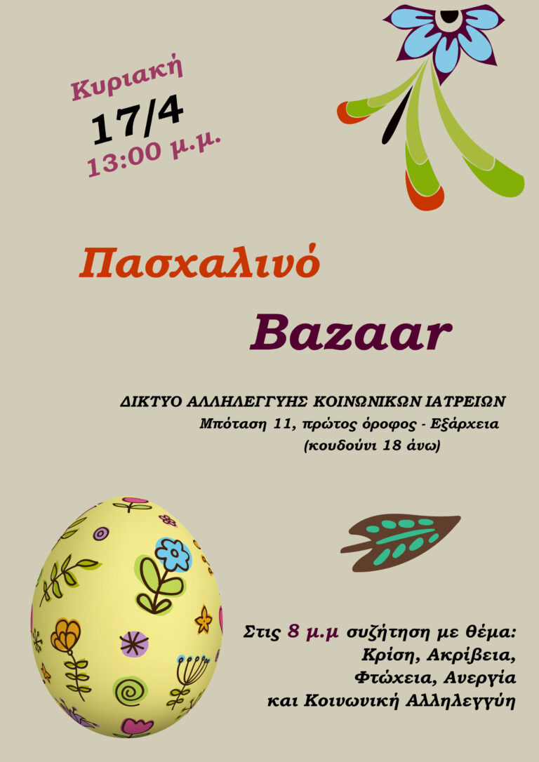 Το Δίκτυο Αλληλεγγύης Κοινωνικών Ιατρείων και το Σωματείο Υποστήριξης του 18Ανω οργανώνουν πασχαλινό Bazaar την Κυριακή των Βαΐων, 17 Απρίλη, από τη 1 το μεσημέρι, στα γραφεία του Σωματείου (Μπόταση…