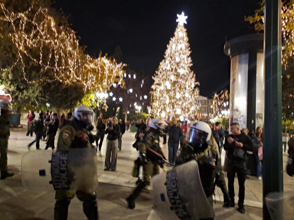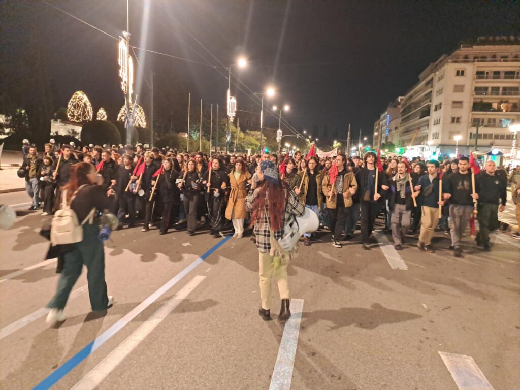 Από την έναρξη της πορείας από τα Προπύλαια, ισχυρές δυνάμεις των ΜΑΤ βάδιζαν στο πλάι των διαδηλωτών. Μπροστά στη Βουλή, στο σημείο που έχουν γραφτεί τα ονόματα των 57 νεκρών του εγκλήματος των Τεμπών, δυνάμεις των ΥΜΕΤ βεβήλωναν το χώρο για να μην πλησιάσει κανείς. Όταν η πορεία έφθασε στη Βουλή ενισχύθηκαν με δυνάμεις των ΜΑΤ – αν και κανείς δεν κινήθηκε προς τα εκεί. Προφανώς, ήταν η “στρατηγική” του Χρυσοχοῒδη να δείξει ότι παράγει έργο…