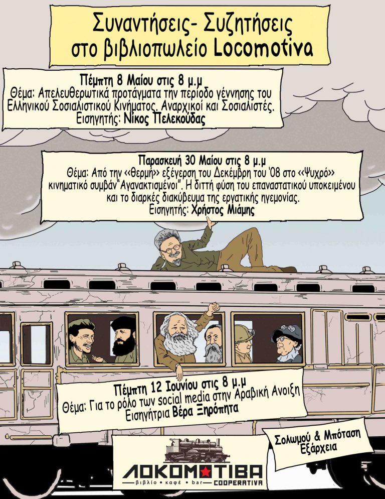 1. Πέμπτη 8 Μαίου στις 8 μ.μΘέμα: Απελευθερωτικά προτάγματα την περίοδο γέννησης του Ελληνικού Σοσιαλιστικού Κινήματος. Αναρχικοί και Σοσιαλιστές.Εισηγητής: Νίκος Πελεκούδας 2. Παρασκευή 30 Μαΐου στις 8 μ.μΘέμα: Από…