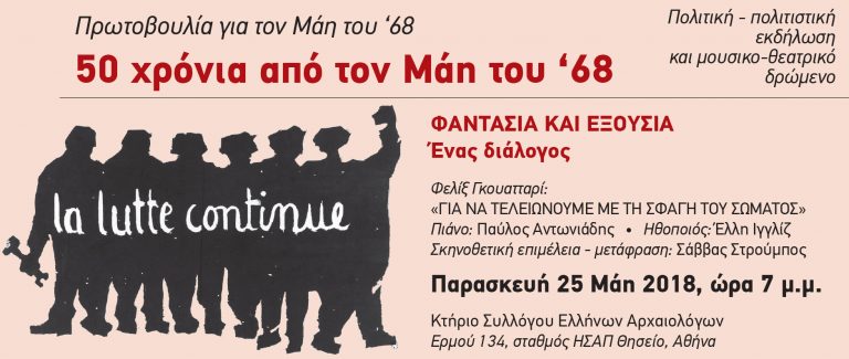 Πρωτοβουλία για το Mάη του ‘68 50 χρόνια από τον Mάη του ’68 ΦANTAΣIA KAI EΞOYΣIA Ένας διάλογος Πολιτική – πολιτιστική εκδήλωση και μουσικο-θεατρικό δρώμενο Φελίξ…