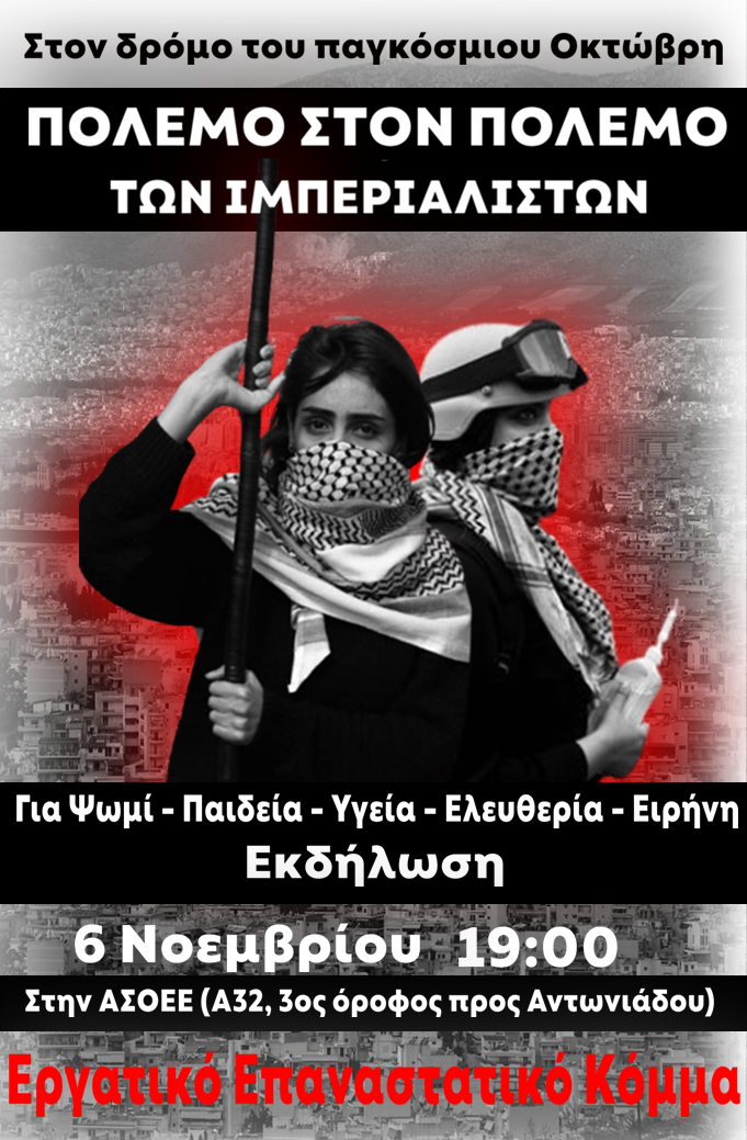 Στο δρόμο του παγκόσμιου Οκτώβρη ΠΟΛΕΜΟ ΣΤΟΝ ΠΟΛΕΜΟ ΤΩΝ ΙΜΠΕΡΙΑΛΙΣΤΩΝ Για Ψωμί – Παιδεία – Υγεία – Ελευθερία – Ειρήνη Πολιτική Εκδήλωση Τετάρτη 6 Νοεμβρίου, 7 μ.μ. AΣΟΕΕ (Πατησίων 76,…