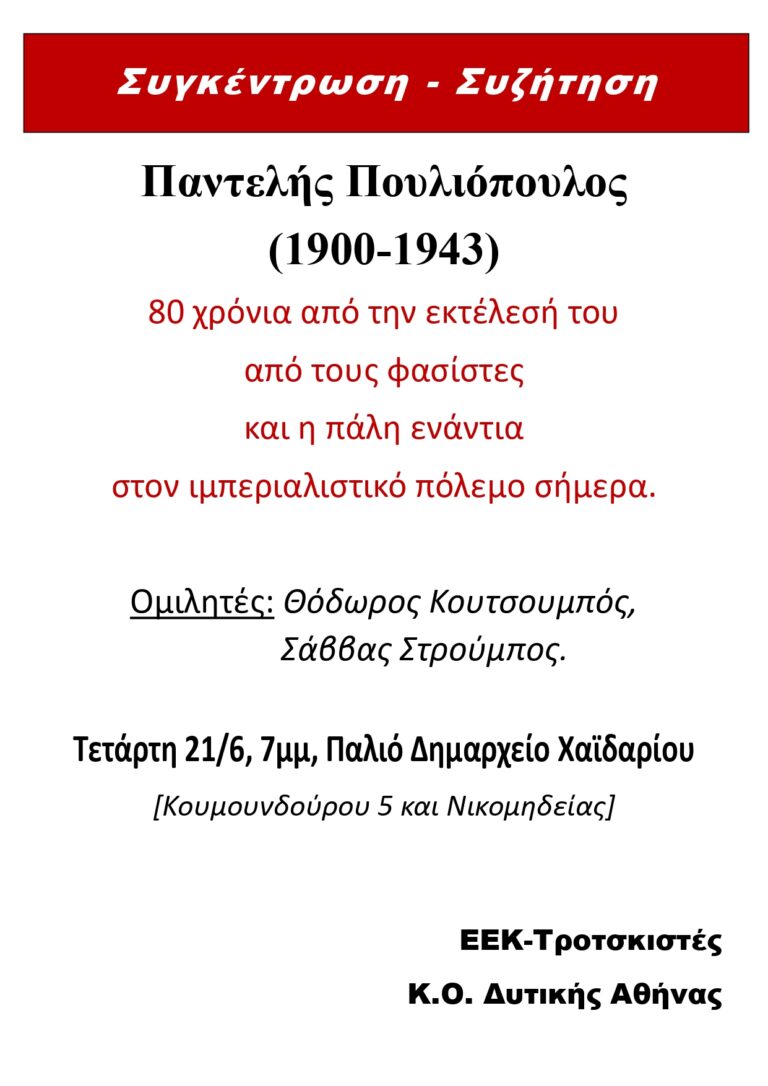 80 χρόνια από την εκτέλεση του κομμουνιστή – τροτσκιστή ηγέτη Παντελή Πουλιόπουλου από τους Ιταλούς φασίστες κατακτητές Εκδήλωση – Συζήτηση στο Χαϊδάρι Τετάρτη 21/6, 7 μ.μ., Παλιό Δημαρχείο Χαϊδαρίου [Κουμουνδούρου…