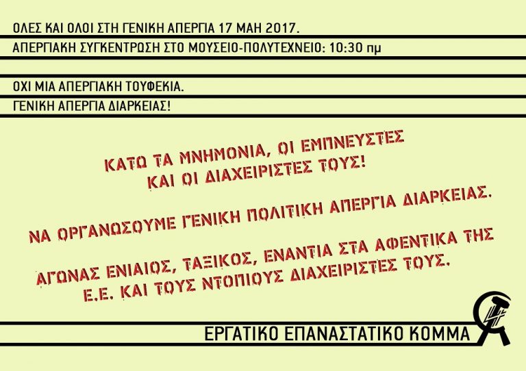 ΠAPTE MEPOΣ ΣTH ΓENIKH AΠEPΓIA 17/5/2017 Γενική Πολιτική Απεργία Διαρκείας Εργατική εξουσία – σοσιαλιστική έξοδος από την κρίση Μέχρι τις 17 ή 18 Μαΐου, η…