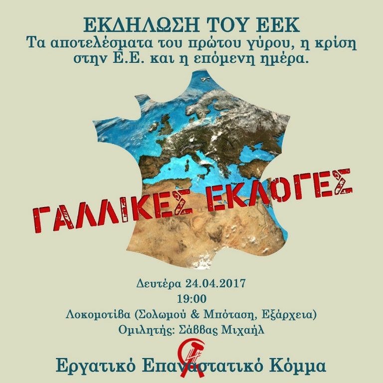 “Τα αποτελέσματα του πρώτου γύρου, η κρίση στην Ε.Ε. και η επόμενη ημέρα” Δευτέρα 24.04.2017 19:00 Λοκομοτίβα(Σολωμού & Μπόταση, Εξάρχεια) Ομιλητής Σάββας Μιχαήλ