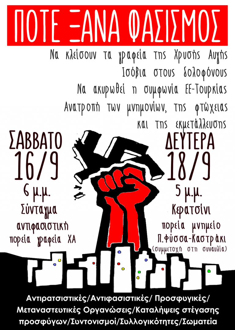 ΕΝΩΤΙΚΟ ΑΝΤΙΦΑΣΙΣΤΙΚΟ ΚΑΛΕΣΜΑ ΑΓΩΝΑ ΚΑΙ ΜΝΗΜΗΣ 4 ΧΡΟΝΙΑ ΑΠΟ ΤΗ ΔΟΛΟΦΟΝΙΑ ΤΟΥ ΠΑΥΛΟΥ ΦΥΣΣΑ Σάββατο 16 Σεπτέμβρη 2017, 6 μ.μ. Αντιφασιστική Συγκέντρωση και Διαδήλωση στο Σύνταγμα και Πορεία από τη…