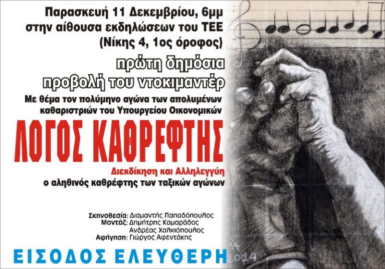 Πρώτη δημόσια προβολή του ντοκιμαντέρ «Λόγος Καθρέφτης» Την Παρασκευή 11 Δεκέμβρη. στις 6μμ, στην αίθουσα εκδηλώσεων του Τεχνικού Επιμελητηρίου Ελλάδας (Νίκης 4, στο Σύνταγμα) θα γίνει η πρώτη δημόσια προβολή του…