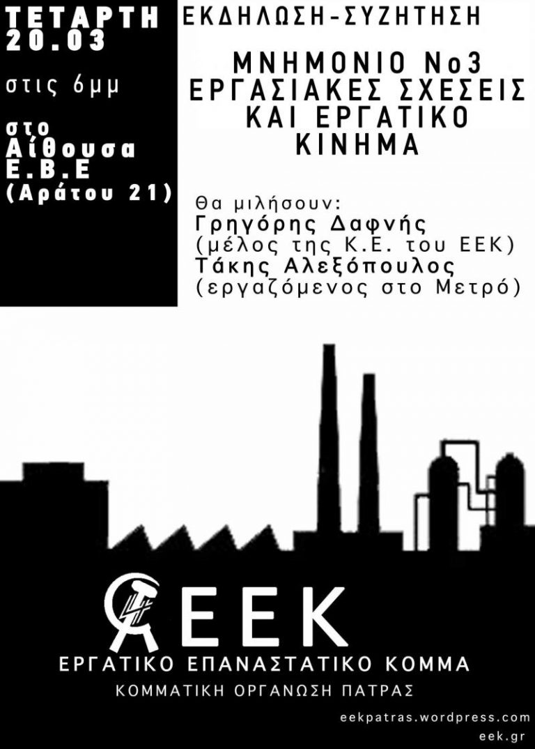 συζήτηση με θέμα:“Δουλειά με το κομμάτι ή ανεργία με το… κιλό;”. Θα μιλήσουν εργαζόμενοι στο Μετρό, την ΕΘΕΛ, στους Δήμους, στον κλάδο του καθαρισμού, άνεργοι-ες, δημοσιογράφοι, συνταξιούχοι κ.ά. Διοργάνωση: Ανοιχτή…