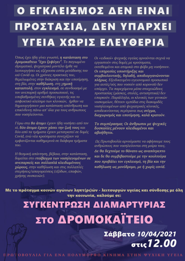 Παρέμβαση και Συγκέντρωση διαμαρτυρίας στο Δρομοκαϊτειο Σάββατο 10/4/2021, 12.00 Σε παρέμβαση – συγκέντρωση διαμαρτυρίας καλεί η Πρωτοβουλία για ένα Πολύμορφο Κίνημα στην Ψυχική Υγεία, έξω από το ψυχιατρικό νοσοκομείο Δρομοκαΐτειο,…