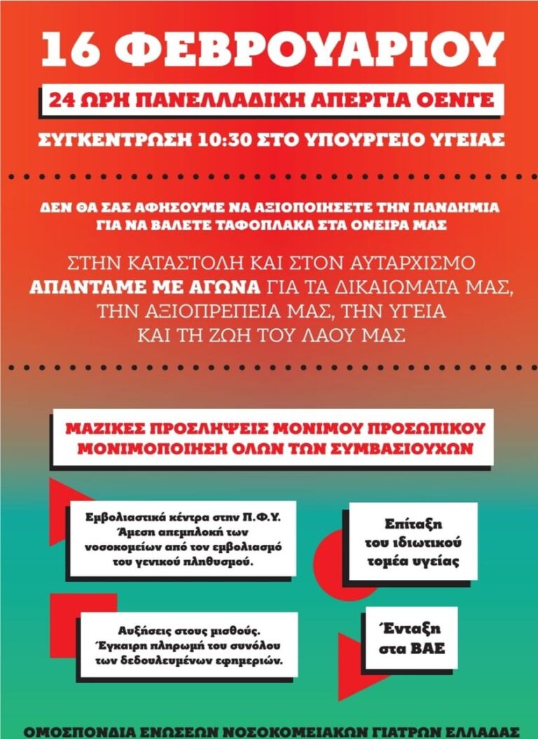 Η ΟΕΝΓΕ, η ομοσπονδία ενώσεων νοσοκομειακών γιατρών, προετοιμάζεται για την μεγάλη υγειονομική απεργία της Τρίτης 16 Φεβρουαρίου. Ταυτόχρονα δίνει τη μάχη στα νοσοκομεία για την αντιμετώπιση της πανδημίας του κορονοϊού,…