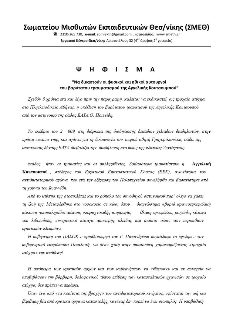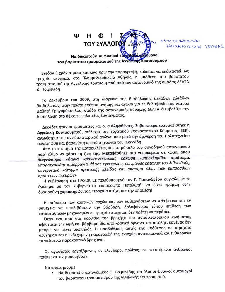 Να δικαστούν οι φυσικοί και ηθικοί αυτουργοί του βαρύτατου τραυματισμού της Aγγελικής Kουτσουμπού Σχεδόν 5 χρόνια μετά και λίγο πριν την παραγραφή, καλείται να εκδικαστεί, ως τροχαίο ατύχημα, στο…