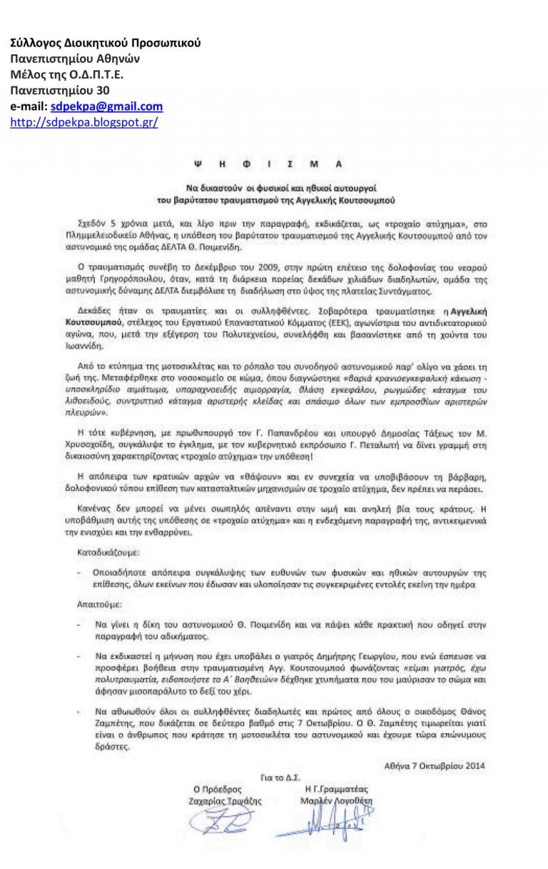 ΠΑΝΕΛΛΗΝΙΟ ΣΩΜΑΤΕΙΟ ΕΡΓΑΖΟΜΕΝΩΝ ΤΙΜ (Wind)Αρ. Απόφασης Πρωτοδικείου Αθηνών 4348/2005Τηλ.: 210 5100910– Φαξ: 210 5100961 – E-mail : symboulio@pasetim.com————————————————————————————————Αρ.Πρωτ.: 50/201409/10/2014Να δικαστούν οι φυσικοί και ηθικοί αυτουργοί του βαρύτατου τραυματισμού της Aγγελικής…