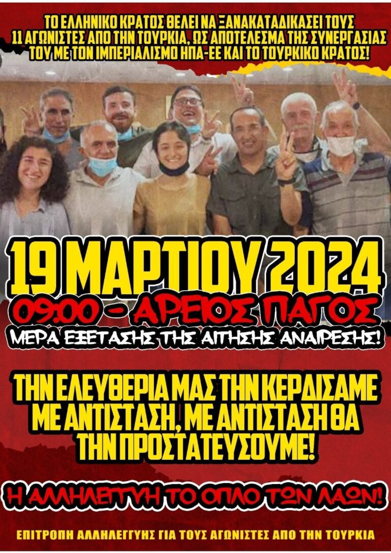 ΣΥΓΚΕΝΤΡΩΣΗ ΣΤΟΝ ΑΡΕΙΟ ΠΑΓΟ: Τρίτη 19 Μαρτίου 2024, 09:00 του Θόδωρου Κουτσουμπού Οι 11 αγωνιστές της Επιτροπής Αλληλεγγύης στους πολιτικούς κρατούμενους από την Τουρκία και το Κουρδιστάν ξανα-δικάζονται την Τρίτη…