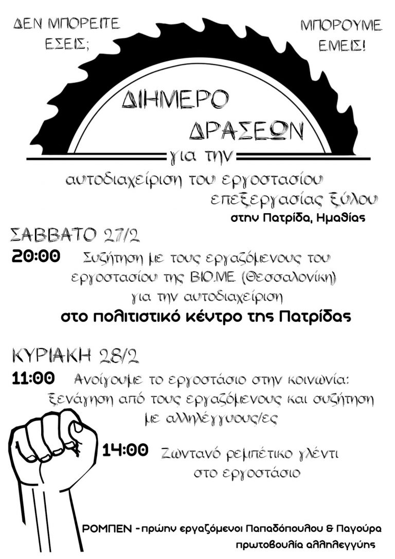 Βάζουμε μπροστά τις μηχανές. Με αυτοδιαχείριση και αγώνα, για την επαναλειτουργία του εργοστασίου ξυλείας στην Πατρίδα της Βέροιας Ακολουθεί το κείμενο των εργαζομένων: Είμαστε οι εργαζόμενοι και οι…
