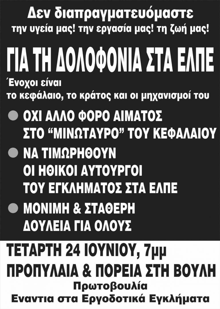 ΟΛΟΙ ΣΤΗ ΔΙΑΔΗΛΩΣΗ ΤΗΝ ΤΕΤΑΡΤΗ 24 ΙΟΥΝΙΟΥ, 7 μμ ΠΡΟΠΥΛΑΙΑ & ΠΟΡΕΙΑ ΣΤΗ ΒΟΥΛΗ ΟΧΙ ΑΛΛΟ ΦΟΡΟ ΑΙΜΑΤΟΣ ΣΤΟ “ΜΙΝΩΤΑΥΡΟ” ΤΟΥ ΚΕΦΑΛΑΙΟΥ ΝΑ ΤΙΜΩΡΗΘΟΥΝ ΟΙ ΗΘΙΚΟΙ ΑΥΤΟΥΡΓΟΙ ΤΟΥ ΕΓΚΛΗΜΑΤΟΣ ΜΟΝΙΜΗ…