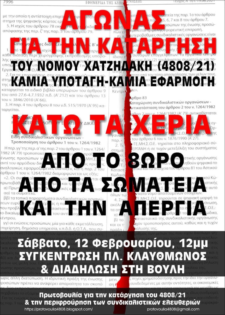Σάββατο, 12/2/2022, 12 μ.μ., Πλ. Κλαυθμώνος • Καμιά υποταγή – καμιά εφαρμογή των διατάξεων του ν. 4808/21 • Κάτω τα χέρια από το 8ωρο και τις εργατικές κατακτήσεις • Κάτω τα χέρια από…