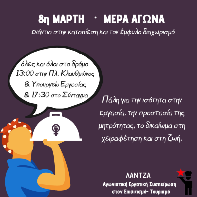 ΕΡΓΑΤΙΚΑ ΣΩΜΑΤΕΙΑ ΚΑΙ ΣΧΗΜΑΤΑ ΚΑΛΟΥΝ ΓΙΑ ΤΗΝ ΗΜΕΡΑ ΤΗΣ ΓΥΝΑΙΚΑΣ Μια σειρά εργατικά σωματεία και σχήματα καλούν σε συμμετοχή στις εκδηλώσεις για την Διεθνή Ημέρα της Γυναίκας, αύριο Δευτέρα 8…