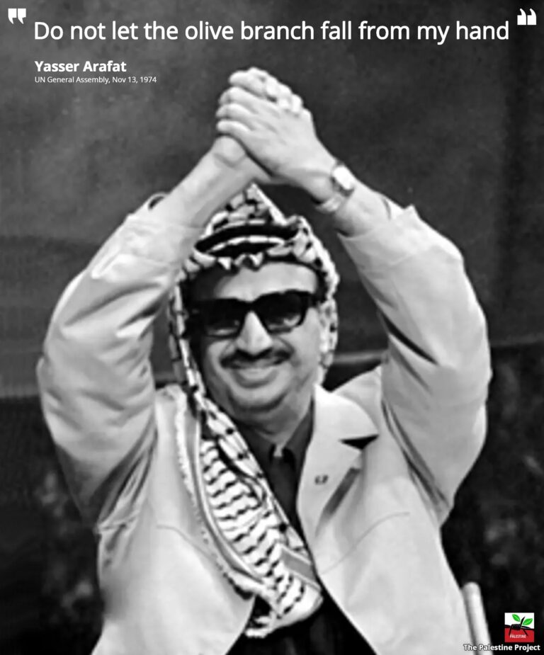 Ένα ιστορικό κείμενο, Νέα Υόρκη, έδρα του ΟΗΕ, 13 Νοεμβρίου 1974 «Σήμερα ήρθα κρατώντας ένα κλαδί ελιάς και το όπλο του αγωνιστή της ελευθερίας. Μην αφήσετε το κλαδί ελιάς να…