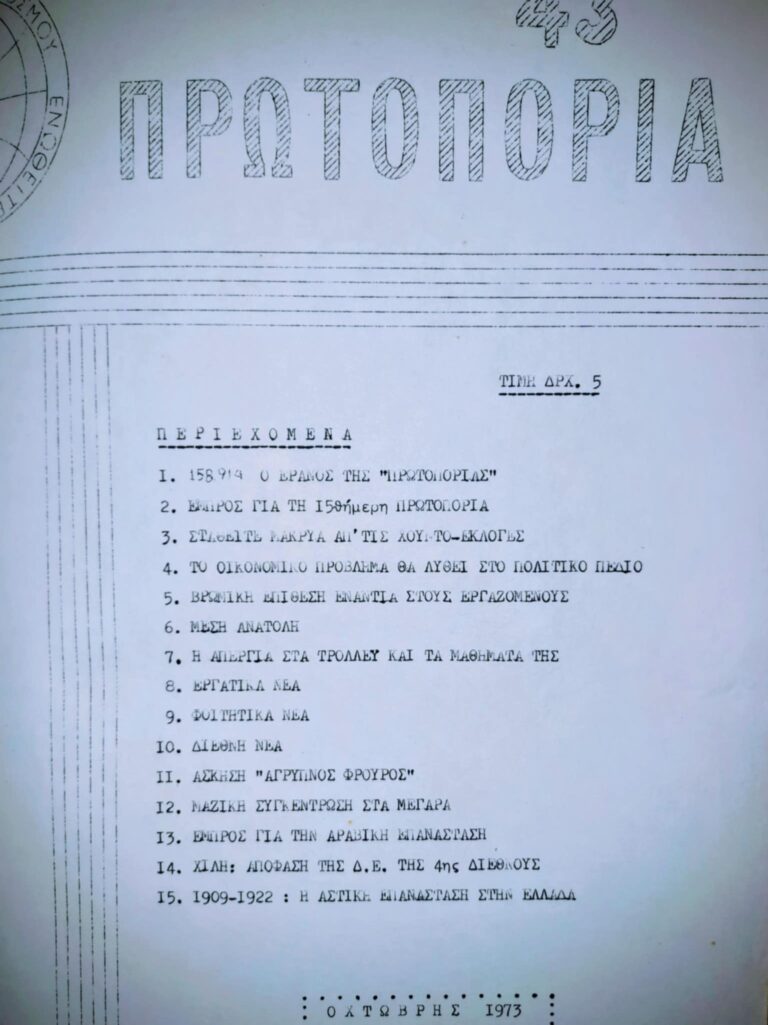 Ένα κείμενο του 1973 στην παράνομη Πρωτοπορία, παραμονές της εξέγερσης του Πολυτεχνείου και λίγες μέρες μετά τον Αραβο-Ισραηλινό πόλεμο του Γιόμ Κιπούρ [ Από το παράνομο περιοδικό Πρωτοπορία, της ΕΔΕ…