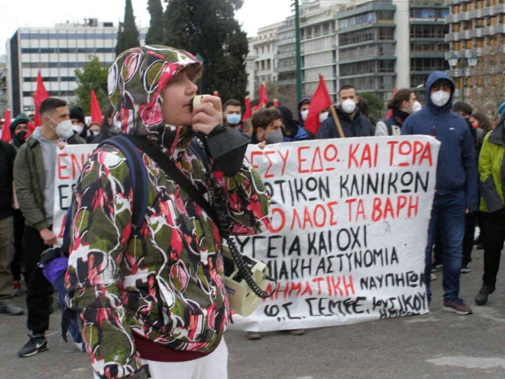 Μετά από δίωρη διαμαρτυρία έξω από τη Βουλή οι συγκεντρωμένοι έκαναν πορεία προς το υπουργείο Υγείας με το πανό της Πρωτοβουλίας και των εργαζομένων του νοσοκομείου Παίδων Πεντέλης στην πρώτη γραμμή. Στο νοσοκομείο Παίδων Πεντέλης δίνεται μια μεγάλη μάχη ενάντια στην υποβάθμιση του νοσοκομείου που επιβάλει η κυβέρνηση, καταργώντας τις 24ωρες εφημερίες για την περίθαλψη των ασθενών παιδιών και μετατρέποντάς το σε εμβολιαστικό κέντρο. Τα συνθήματα των διαδηλωτών στρέφονταν κατά της θανατοπολιτικής της κυβέρνησης Μητσοτάκη που έχει «επιτύχει» το θλιβερό ρεκόρ 80 – 100 ή και παραπάνω νεκρών από Covid-19 καθημερινά. Μερικά από τα συνθήματα έλεγαν «Δώστε λεφτά για την υγεία, όχι για Ραφάλ και την αστυνομία», «Κάθε μέρα πεθαίνουν εκατό, κι αυτοί στα αεροπλάνα κάνουν αγιασμό», «Αυτό, αυτό είναι σωστό, δωρεάν υγεία για όλο το λαό». Μερικά συνθήματα «στόλιζαν» τον ανεκδιήγητο Μωυσή που προΐσταται της κυβέρνησης με το «Μητσοτάκη κάθαρμα», ενώ ιδίως έξω από το υπουργείο υγείας τον «φασίστα Πλεύρη» (υπουργό υγείας).