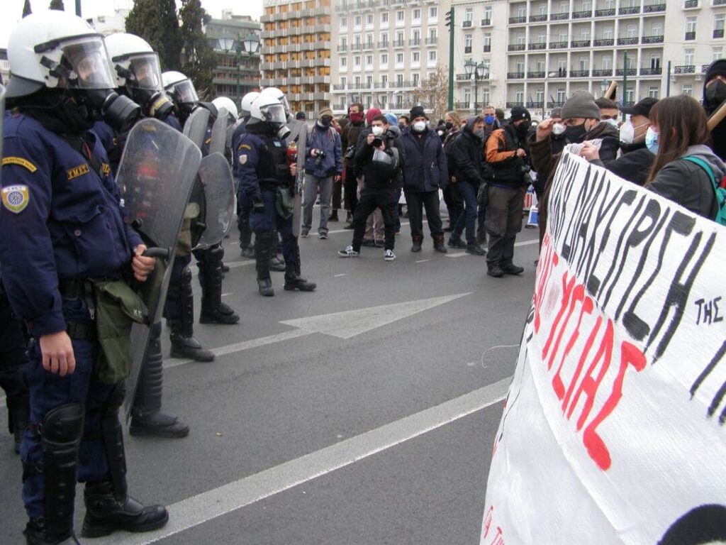Στην Αθήνα, το μεσημέρι του Σαββάτου 22/1 πάνω από 2 – 2,5 χιλιάδες συγκεντρώθηκαν στο Σύνταγμα μπροστά στο μνημείο του Άγνωστου Στρατιώτη στη Βουλή. Η αρχική απόπειρα της αστυνομίας να περιορίσει τη συγκέντρωση στην πλατεία και να αποτρέψει την διαδήλωση στην Αμαλίας κάμφθηκε. Οι διαδηλωτές με αποφασιστικότητα προχώρησαν προς τον Άγνωστο Στρατιώτη. Επιθετική κίνηση των μονάδων καταστολής, μπλε στην αρχή με την συνδρομή των χακί ΜΑΤατζήδων, ενώ η συγκέντρωση εξελισσόταν ομαλά και ειρηνικά, στην Αμαλίας, προς την πλευρά της Όθωνος όπου άπλωναν τα πανό τους σύντροφοι της αναρχίας, αποτράπηκε μπροστά στην σταθερότητα των διαδηλωτών.