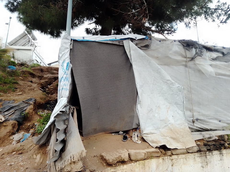 Έχουμε βγει πλέον από το καμπ, βρισκόμαστε στον εξωτερικό χώρο, στα χωράφια που βρίσκονται έξω από το κτίριο του ΚΥΤ. Μέσα στις λάσπες βρίσκονται κάποιες σκηνές, αυτά τα χωράφια, μας ενημερώνουν, ήταν γεμάτα από σκηνές μέχρι και πριν από λίγες μέρες. Εκεί καταφέρνουμε να σηκώσουμε τη φωτογραφική.