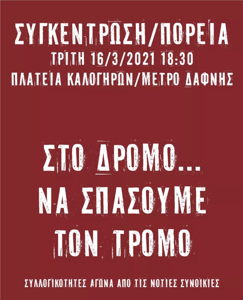 Συγκέντρωση – Πορεία, την Τρίτη 16/3/2021, 18:30 στην πλατεία Καλογήρων/μετρό Δάφνης